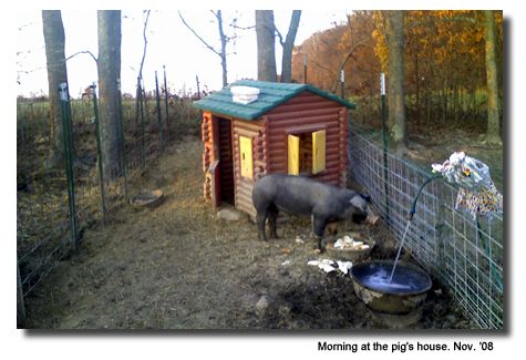 Here is a picture of one of our pigs in November, '08, enjoying a meal and a constitutional outside of his lovely Lil'Tykes log cabin home. Both pigs eventually became too big to fit inside, and they trashed it. I believe these pigs were Rock 'n' Roll Band Stars in a previous life. You may begin discussing Karma to yourselves. I'm thinking of ham for dinner.